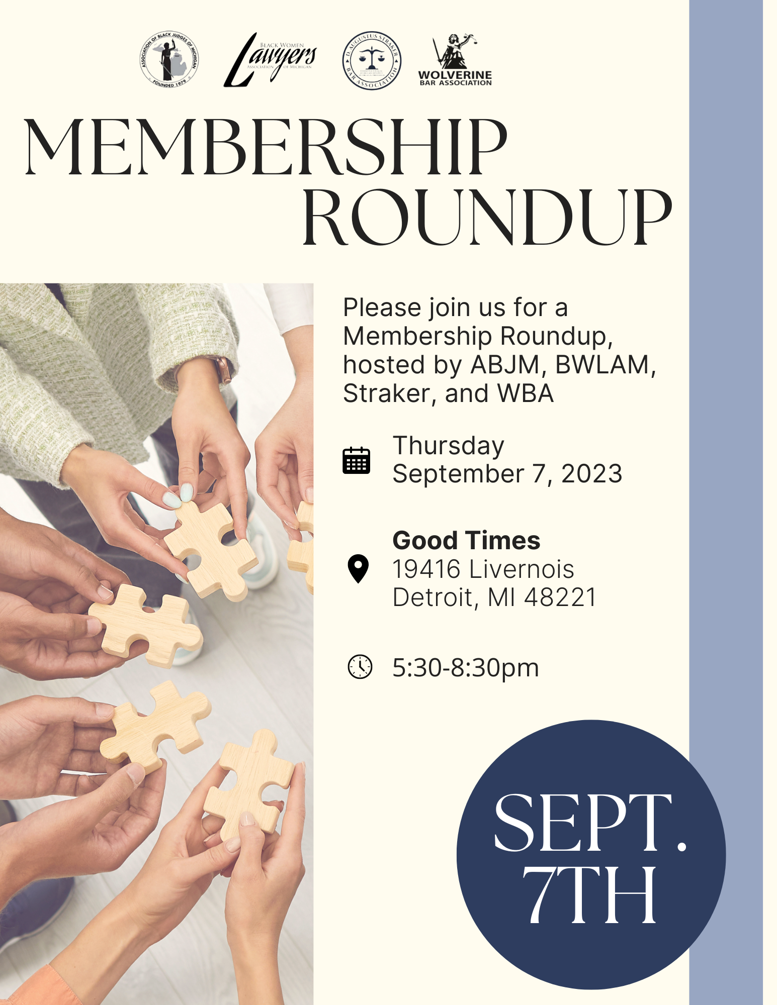 Please join the Wolverine Bar Association, alongside ABJM, BWLAM, and Straker, for our upcoming 2023 Membership Roundup. Thursday, September 7, 2023Good…